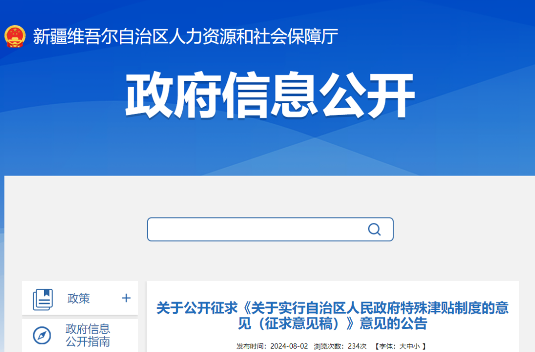 近日,新疆维吾尔自治区人社厅发布关于公开征求《关于实行自治区人民政府特殊津贴制度的意见(征求意见稿)》意见的公告。