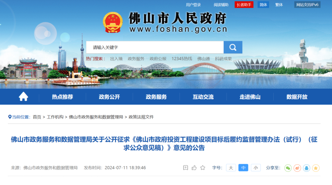 近日,佛山市政务服务和数据管理局发布《佛山市政府投资工程建设项目标后履约监督管理办法(试行)(征求公众意见稿)》。